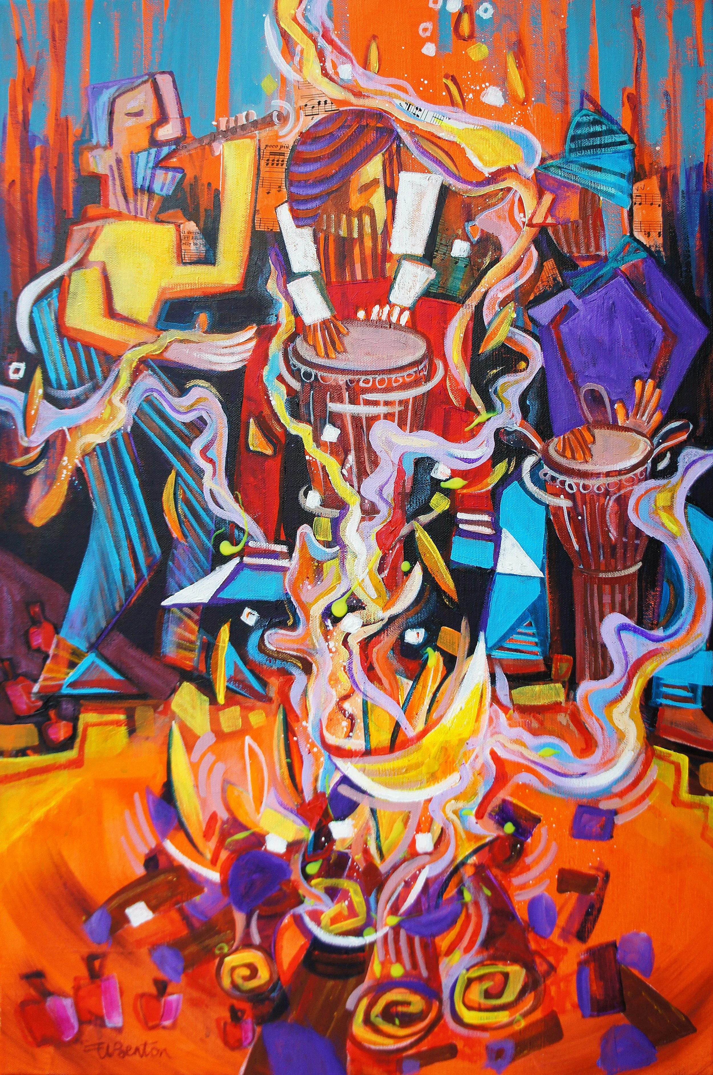 Ellie Benton primarily works in intuitive painting, exploring the emotional, physical, and spiritual dynamics of human relationships and interactions. While her work is predominantly abstract, some pieces incorporate figurative elements inspired by nature, blurring the line between representation and geometric form. A powerful life force runs through all of Ellie’s paintings, and by detaching them from literal interpretation, she invites viewers to discover their own meanings and associations.